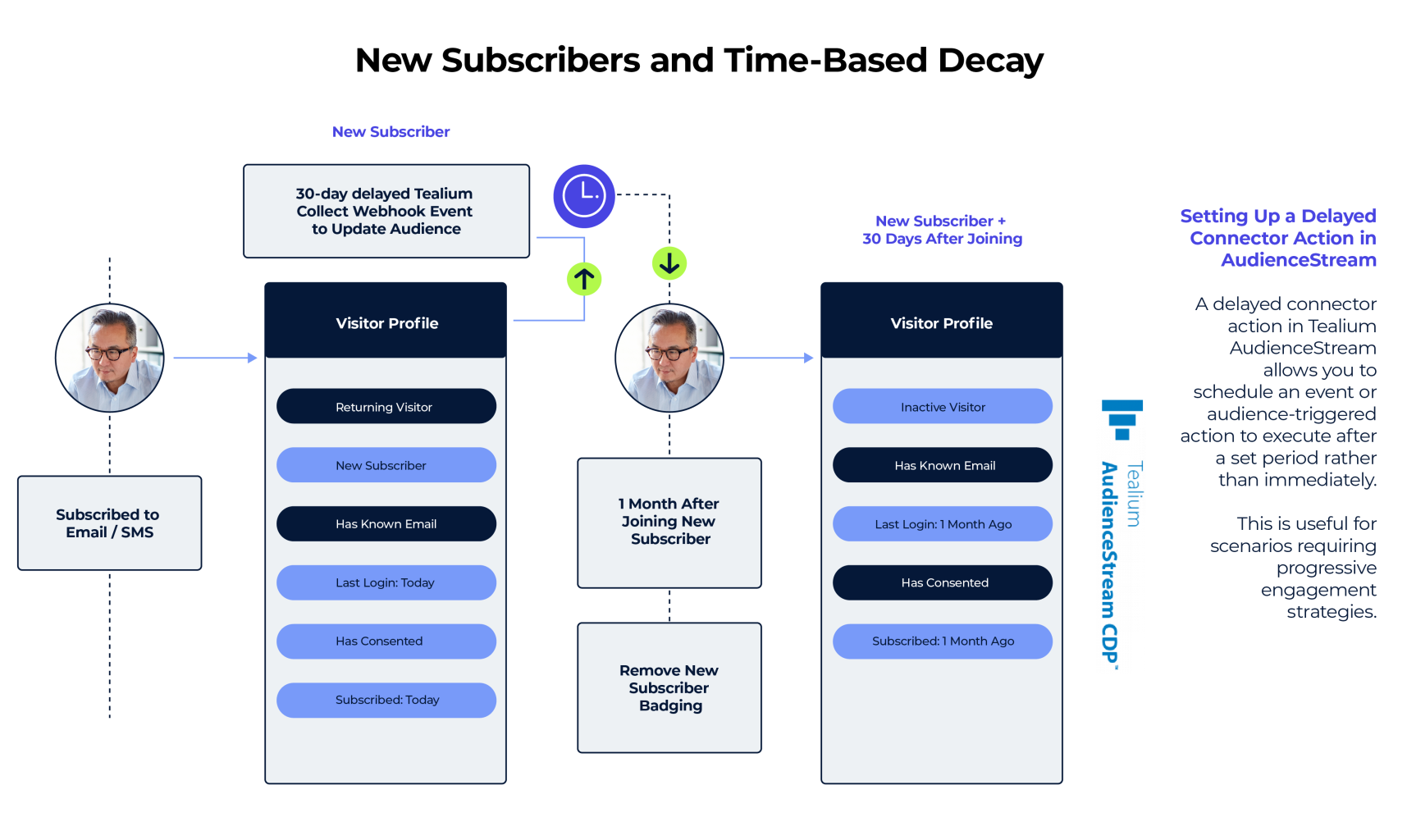 Delayed Action Connectors in Tealium AudienceStream allow users to trigger events at specific time intervals after a visitor joins an audience. This feature is particularly useful for managing inactive visitors, triggering engagement campaigns, and automating time-based audience transitions.
