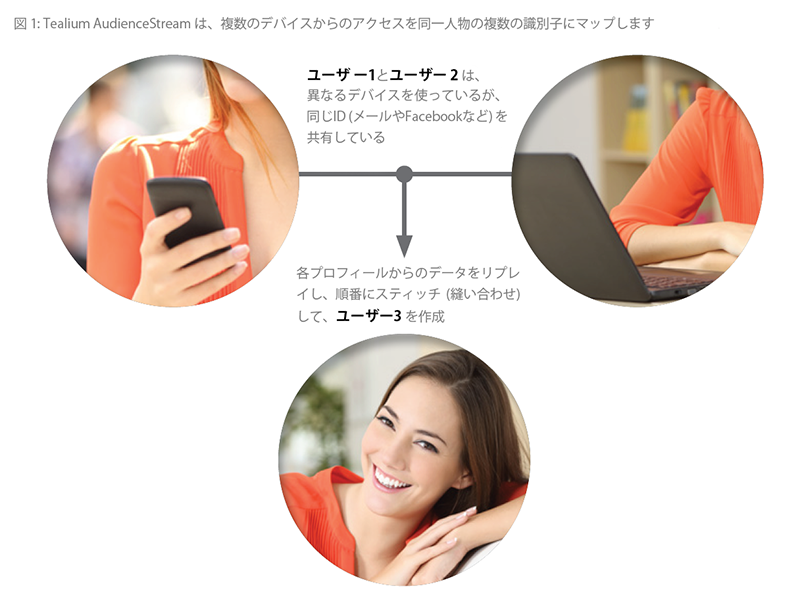 プロファイル間のIDが一致すると、Tealiumの特許技術であるビジタースティッチング技術(貴社独自のニーズに応じて構成可能)が、プロファイルとIDを自動的に結びつけてリアルタイムに再構築し、あらゆるデバイスや場所、時間を超えて顧客のブランドエンゲージメントの全体像を反映します。